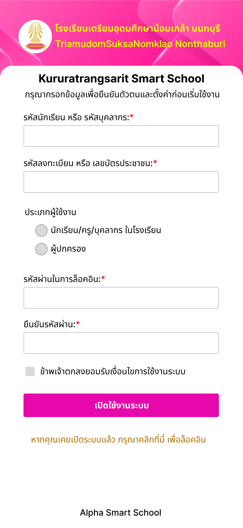 จะต้องกรอกข้อมูลรหัสนักเรียน และเลขบัตรประจำตัวประชาชน ให้ถูกต้องตรงกับที่ลงทะเบียนไว้กับทางโรงเรียน
